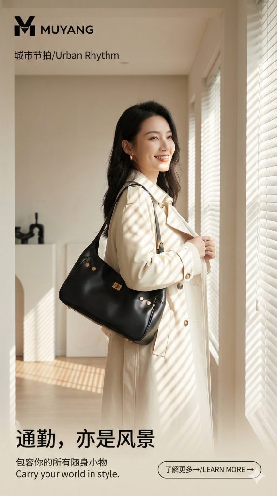 提示词(中文): 9:16竖版高端微距细节海报。背景:奶油色渐变,大量干净负空间。极近距离拍摄上传参考图中缎面面料的光泽质感,展示丝滑反光效果和柔软垂坠感,面料随身体曲线自然流动。左上角MUYANG logo。